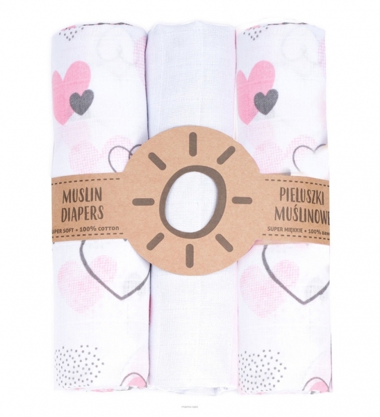 Mušelínové plenky 3ks + žínka zdarma, bílá/růžová - srdíčka