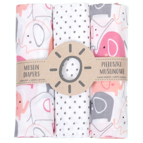 Mušelínové plenky 3ks + žínka zdarma, bílá/růžová/šedá - sloníci/puntíky