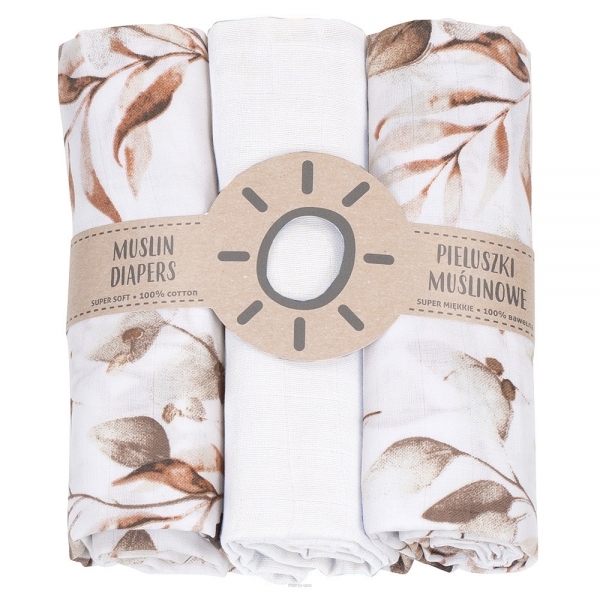 Mušelínové plenky 3ks + žínka zdarma, bílá/béžová - listy
