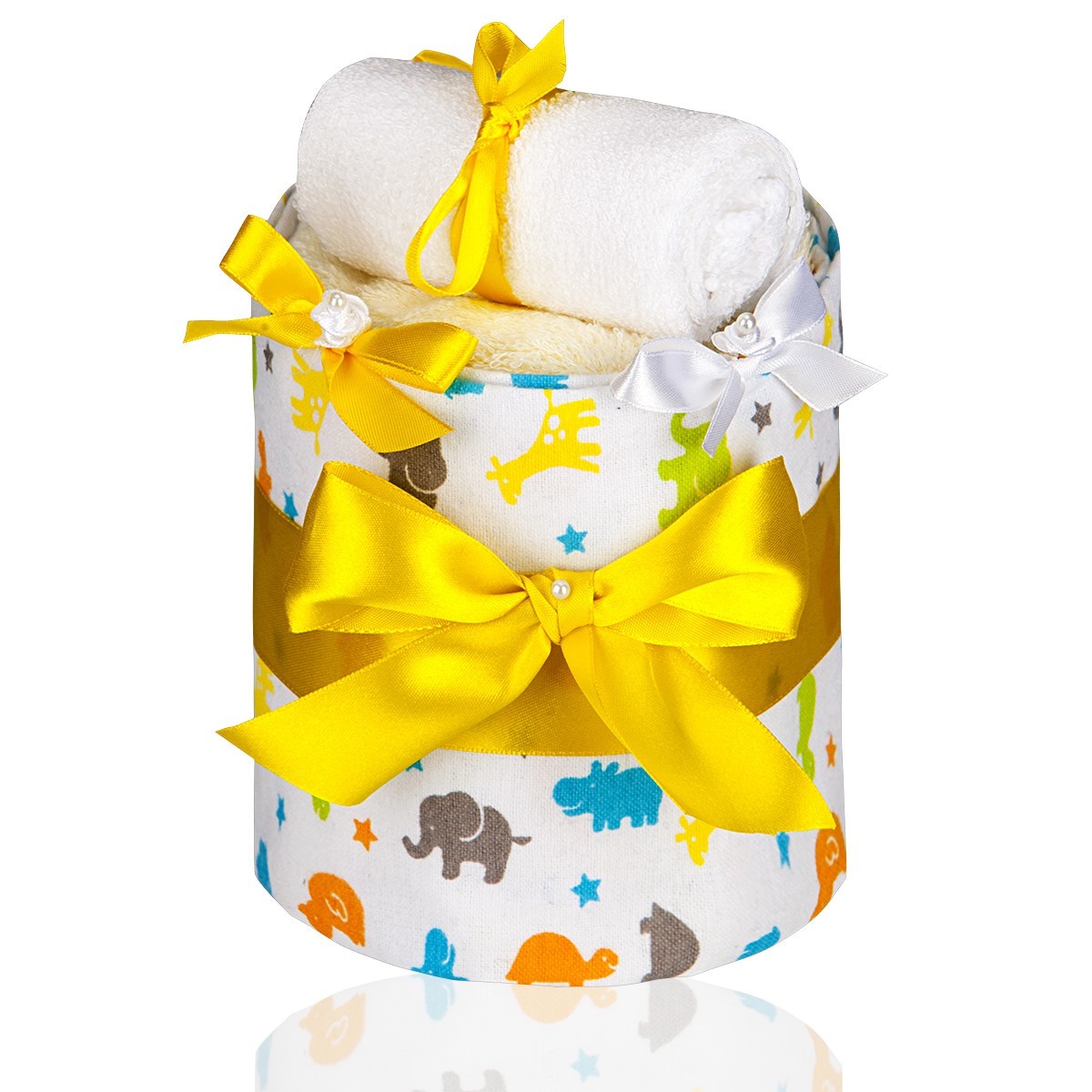 Ručně vyráběný plenkový dort T-tomi je krásným dárkem pro čerstvě narozená miminka nebo maminky v očekávání. Je balen v dárkové krabici s visačkou, na kterou je možné napsat vlastní věnování.