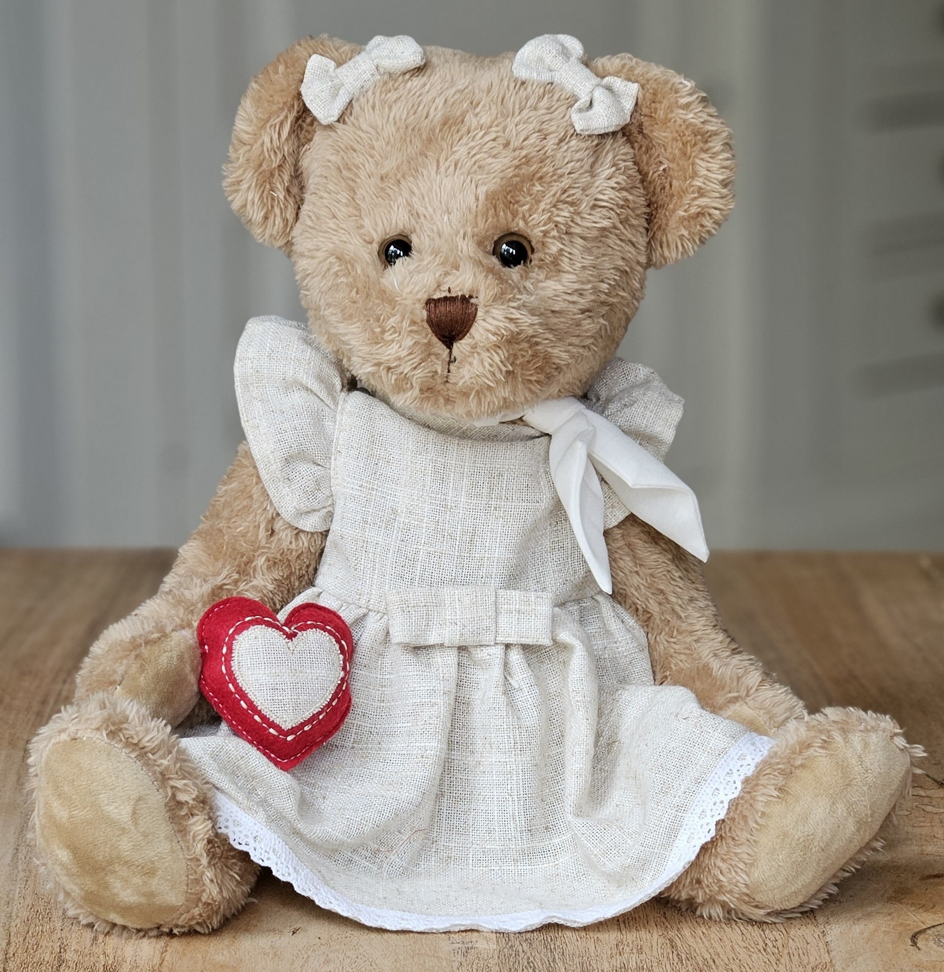 Plyšový medvěd v béžových šatech s šátkem je součástí kolekce belgické značky La Galleria prečítať celé