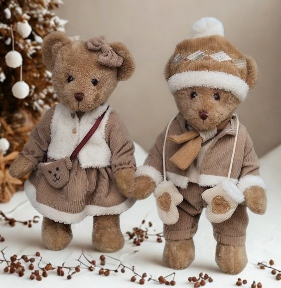 Pár plyšových medvědů v béžovém zimní oblečku