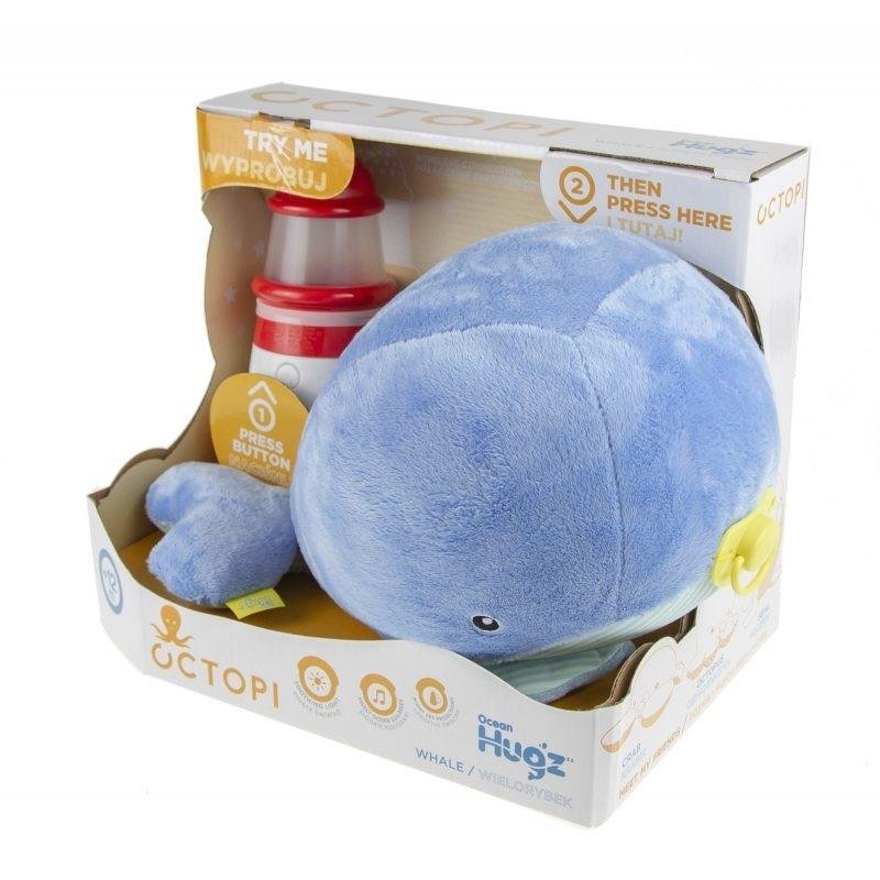 Ocean Hugz - Maskotka Wielorybek i Projektor Latarnia Morska DKM6869. Gdy przytulisz pluszaka, latarnia morska zaczyna grać kołysanki i świecić. Możliwe jest również włączenie samej latarni morskiej, bez konieczności przytulania pluszaka. Latarnia Morska gra kołysanki, świeci delikatnym światłem...