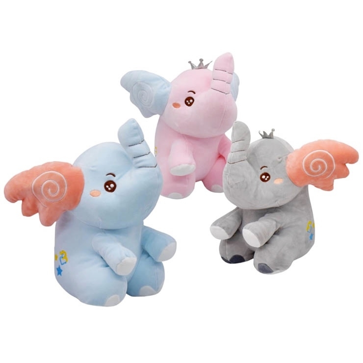 Plyšový stojící slůně s korunkou a vyšívanými očky. Možnost výběru ze tří barev – růžový, šedý nebo modrý. Cena za kus. prečítať celé