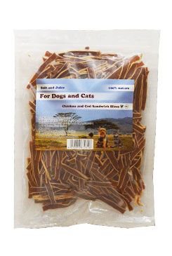 Popis: kuře s treskou sandwich slabé proužky pro psy a kočky.Složení: 88% kuřecí maso, 10% tresčí maso, 2% škrob prečítať celé