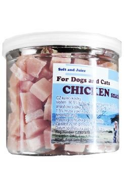 Pochoutka z kuřecího masa v praktické, znovu zavíratelné dóze.Složení: 90,5% kuře, 5% rpstlinný protein, 4,5% škrob. prečítať celé