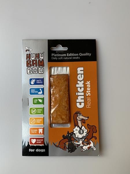 Doplňkové krmivo pro psy.Kuřecí steak - přírodní masová pochoutka pro psy.Krmny? návod: Podávejte jako odměnu při tréninku. Zajistěte dostatek čerstvé vody.Složení: Kuřecí maso 87%, rostlinný protein 4%, kukuřičný škrob 3%, rostlinný glycerin 3%, sorbitol 3%, sůl 0,1%.Analytické složky: protein...