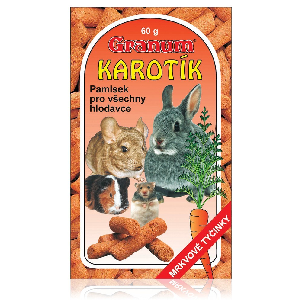 Karotík - mrkvové tyčinky pro hlodavce- bohatý zdroj přírodních vitamínů- příznivě ovlivňuje organizmus - posiluje orgány, sliznice a kůži- urychluje hojení ranSložení:mrkev, kukuřice, pšenice, minerální látky, slunečnicový olej, přibarveno látkami EUDávkování: 1-5ks k běžnému krmivu dle velikosti zvířeteBalení: 60g