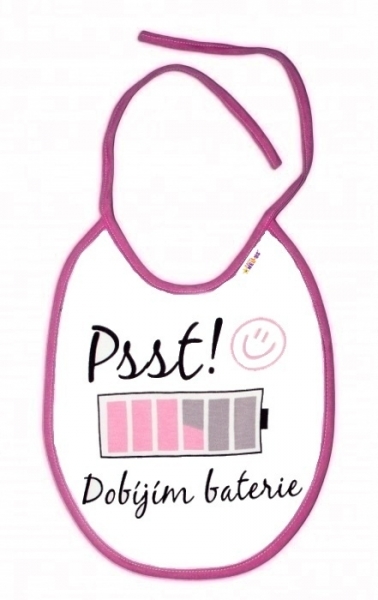 Nepromokavý bryndáček Psst! Dobíjím baterie, 24 x 27 cm - růžový, bílá