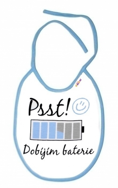 Nepromokavý bryndáček Psst! Dobíjím baterie, 24 x 27 cm - modrý