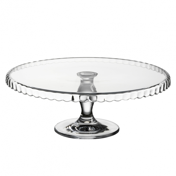 Podnos na nožce s ozdobným okrajem, který je zahnutý dolů a vrchní plocha je hladká pro snadnou manipulaci např. při tvarování. Je skvělý pro servírování bábovky, muffinů, dortů, zákusků… Materiál: sklo. Rozměry: pr. 32 cm, v. 11,5 cm. Můžete ho doplnit skleněným poklopem z naší nabídky – 128356...