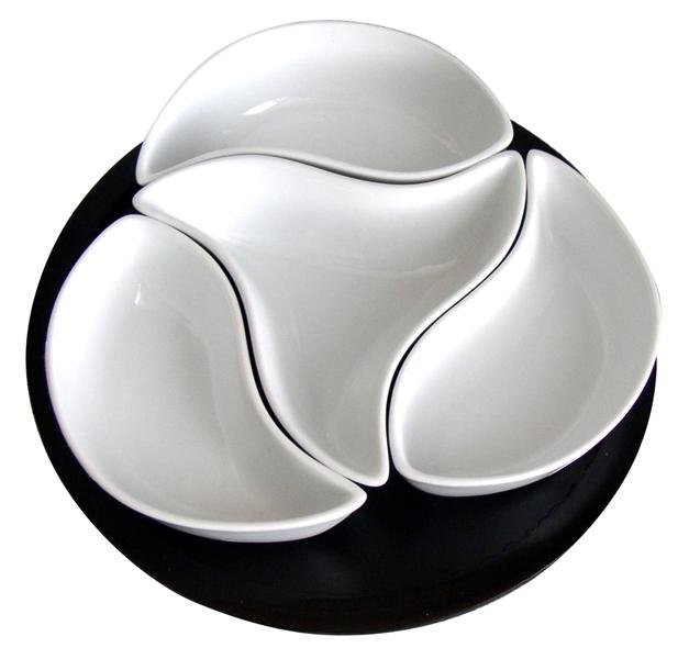 Velmi oblíbená sada čtyř misek "větrník" na dřevěném otáčivém podnose. Velmi praktická při servírování různých pokrmů. Misky mají pěkný moderní design a tvarově jsou velmi zajímavé, Podnos je snadno omyvatelný, stačí přetřít vlhkým hadříkem. Misky jsou vhodné do myčky na nádobí. Objem misek 125...
