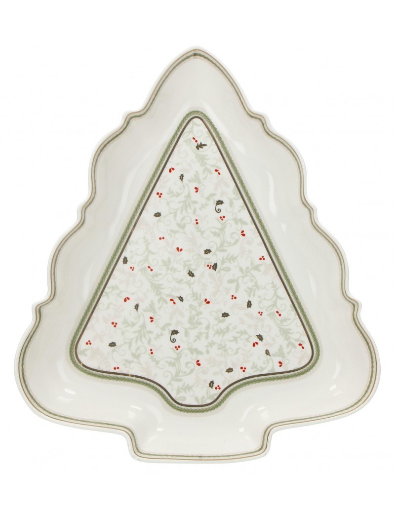 Tác/talíř z porcelánu v šedé/bílé barvě ve tvaru stromu s vánočním motivem.