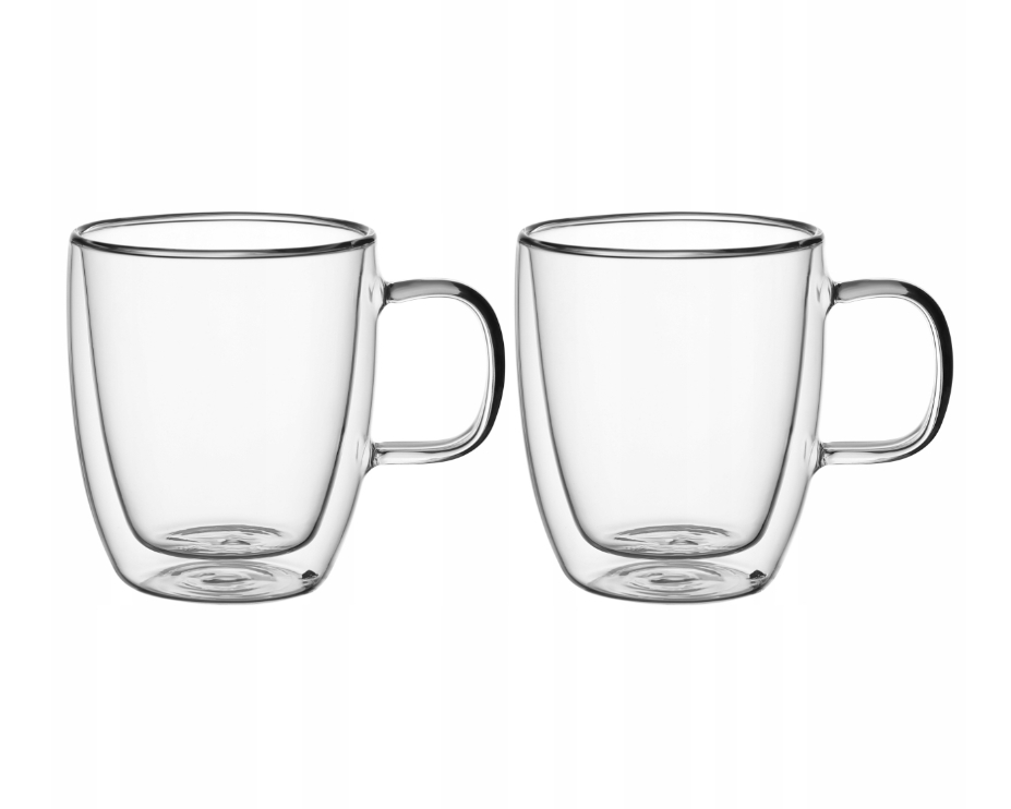 Dvojstěnné termo hrnečky v moderním designu, celkový objem 350 ml. Dvojité borosilikátové sklo udrží dlouho teplotu nápoje. Odolný vůči vysokým a nízkým teplotám, poškrábání, prasklinám i chemikáliím. Odolnější proti tepelné deformaci než běžné sklo. Borosilikátové sklo (použití od -10 °C do +210...