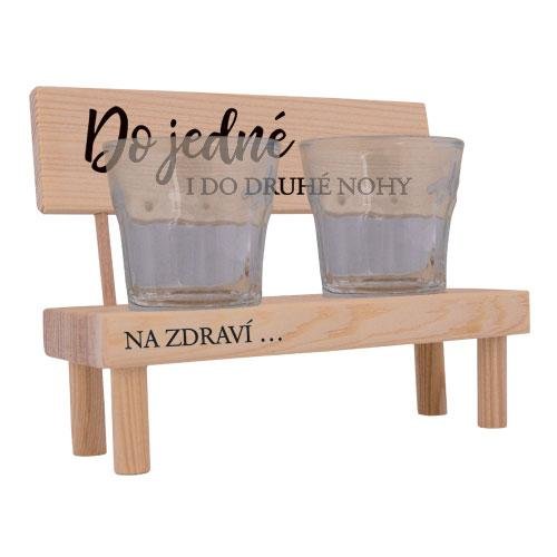 Dřevěná lavička s originálním potiskem je skvělý stojánek na dva panáky na alkohol. Skleničky jsou součástí balení. Připijte si se svými přáteli na zdraví!