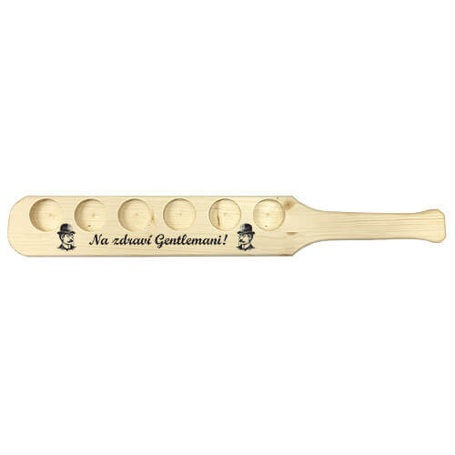 Dřevěný stojan na panáky 53 cm - pro muže, GentlemanyDřevěný držák na skleničky na alkohol pro 6 kamarádů. Slavíte s kamarády a přáteli a potřebujete servírovat panáčky s alkoholem na přípitek? Využijte dřevěný stojan, kterým bez problémů obsloužíte celou společnost. Držák na skleničky pro muže s...