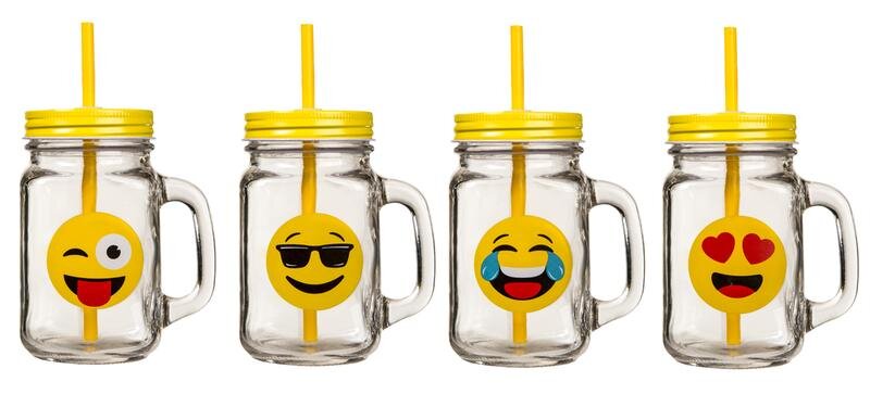 Stylová sklenice "Mason" na míchané drinky s víčkem a brčkem - hodí se jak na alkoholické nápoje, tak nealkoholické, s ovocem, ledem atd. Nesmí chybět na žádné párty. Zároveň tuto sklenici oceníte pro její praktičnost - víčko nejen eliminuje případné vytečení tekutiny, ale také v létě ochrání nápoj před vosami a jiným dotěrným hmyzem. Materiál - sklo, kov - víčko na závit, plast. brčko. Objem 450 ml. Motiv - smajlíci.