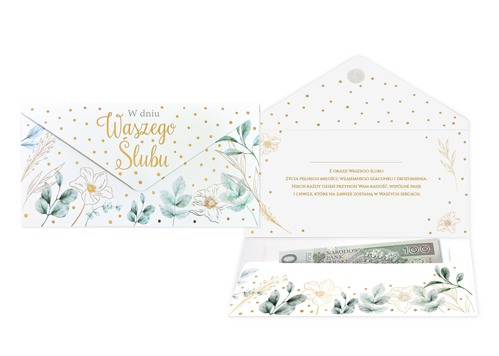 Koperta podarunkowa KOP-019 "Dziękuję"Koperta podarunkowa jest eleganckim sposobem na podarowanie bliskiej osobie banknotu lub karty podarunkowej. Koperta jest kolorowa i uszlachetniona metalizowaną folią hot-stamp, jest solidnie wykonana i wyposażona w rzep, co umożliwia jej wielokrotne otwieranie i zamykanie. Koperta zawiera życzenia w środku.Specyfikacja:wymiary: 20 x 10,5 cm (po złożeniu)wnętrze: życzenia w środkuokazja: podziękowania