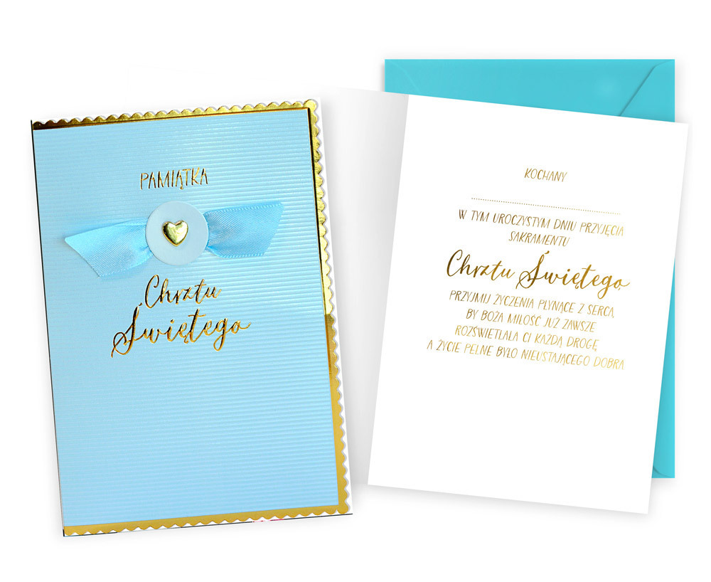 Kartka Dream Cards na Chrzest DK-1299Kartka B6 z ozdobnej serii Dream Cards - nieduża, ale robi wrażenie dzięki atrakcyjnej kolorystyce i ciekawym zdobieniom.To idealny wybór łączący przyjazną cenę z jakością.Cechy szczególne:wielkość: B6, 16.6 x 11.7 cm po złożeniu,koperta: w zestawie, kolorowa,zdobienia: kolorowe, różnorodne, bogate (w zależności od wzoru: przyklejane dekoracje, elementy biżuteryjne, odstawniki, metaliczne folie, tłoczenia itp.),okazja: Chrzest