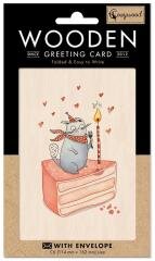 Drewniany karnet w formacie C6 z kopertą. W środku nie zawiera tekstu. Ten karnet jest w 100% biodegradowalny, wykonany przy użyciu minimalnego nakładu energii, gazu i wody. Jego wytworzenie zużywa 5 razy mniej drewna niż wykonanie karnetu papierowego. Karnet posiada certyfikat FSC, gwarantujący odpowiedzialne pozyskiwanie drewna. Wyprodukowany na Litwie.