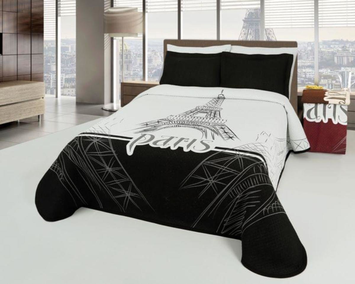 Oboustranný přehoz na postel se zajímavým trendovým motivem Eiffelovy věže a nápisem Paris přidá místnosti na kráse a individualitě.