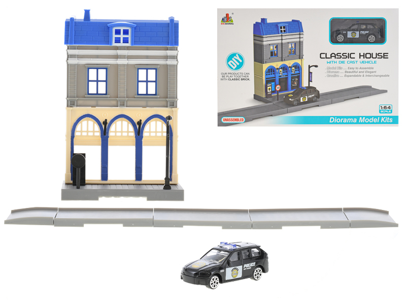 Policejní stanice skládací s autem policie 7cm kov na volný chod v krabičce