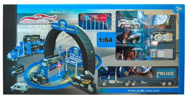 Obsah sady: policejní dopravní okruh/garáž 2v1 (funkce přeměny z garáže na okruh a zpět), kovový model autíčka 1:64 (6 ks) a kamion.Nevhodné pro děti do 3 let. prečítať celé