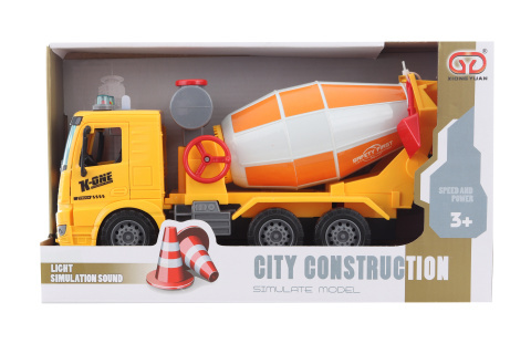 Plastové nákladní auto - míchačka na baterie. Pomocí dvou tlačítek umístěných na kabině vydává zvuky jízdy a couvání. Pomocí kolečka se otáčí cisterna.Baterie 3xAG13 jsou součástí balení. Manuálně lze otáčet s míchací nádobou. Baleno v krabici. Rozměry balení cca 32x11,5x18x5 cm. Rozměry auta cca 27x13x8 cm. Věk 3+