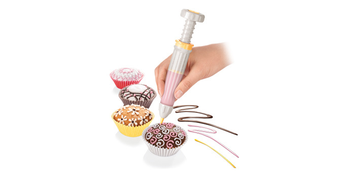 Vynikající pro dekorování pokrmů bílkovým, máslovým, tvarohovým a čokoládovým zdobicím krémem, rozpuštěnou čokoládou i šlehačkou apod. Dodáváno s 5 tryskami pro různé dekorovací techniky včetně velmi jemných dekorů a psaní. S praktickým stojánkem pro snadné plnění a odkládání tužky během zdobení...