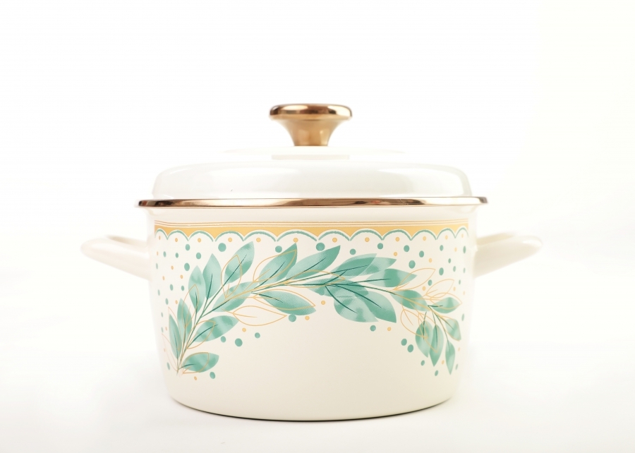 Luxusní smaltované nádobí nejvyšší jakosti. Nádobí je ozdobeno nádherným obtiskem lístků s přidanými prvky ve zlaté barvě. Obtisk krásně ladí s kování a nerezovými ráfky, které jsou taktéž ve zlatém provedení.