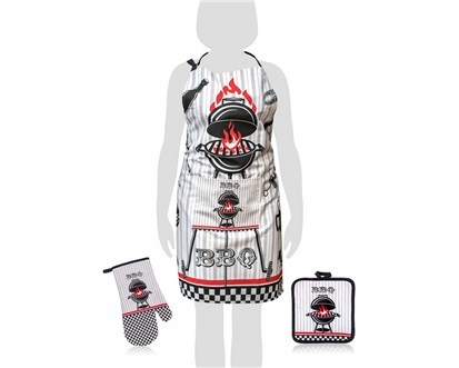 3dílná sada BBQ v bílo-černé barvě obsahuje: zástěra 65 x 80 cm s praktickou kapsou 17 x 23 cm vyrobena ze 100 % bavlny kanvas 140 GSM, chňapka 18 x 33 cm má praktickou prodlouženou zápěsťovou délku vzhledem k použití na BBQ a chňapka 18 x 20 cm, obě chňapky mají potisklý hřbet, jednobarevnou...
