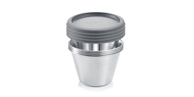 Vynikající pro přípravu a podávání dezertů panna cotta, pudinků, tvarohových či ovocných želé apod., s plastovými víčky pro jejich hygienické uchovávání. Nerezové formičky bez víček jsou vhodné i pro zapékání pokrmů v pečicí troubě. Vhodné do myčky, perfektně skladné. 3 roky záruka.