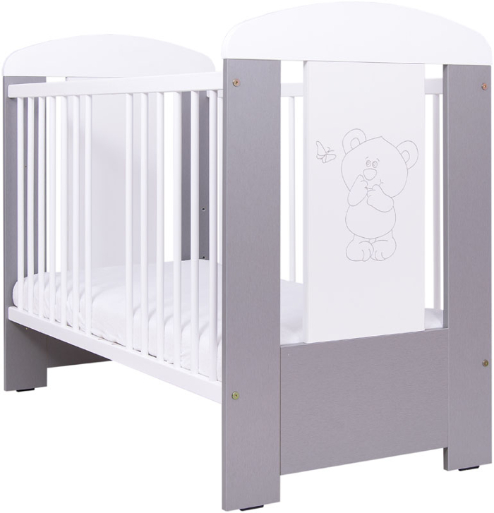 DREWEX Łóżeczko MIŚ I MOTYLEK srebrno-białe opuszczany bok 120x60 cm N