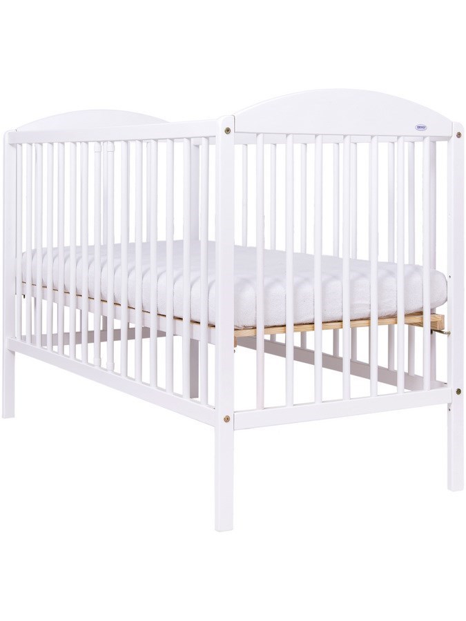 Dětská postýlka Drewex Kuba 2 z borovicového dřeva s klasickým obloukovým designem, ideální pro miminka. Dřevěná postýlka má regulovatelný rošt, který lze nastavit do tří poloh. 19 cm, 33 cm, 46 cm od země. Rozměry: cca 120x60 cm. Matrace není součástí postýlky. Postýlka je se stahovací bočnicí.