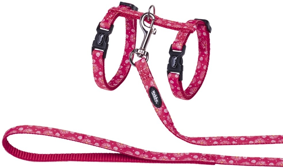 Souprava Flower Red Nobby postroj s vodítkem, vyrobená z odolného nylonu vhodná pro správný vývoj a anatomické tvarování. Oproti obojku drží kočkám pevněji celkovou postavu a předchází tak možnému tahání za krk a poškození páteře. Tento postroj s vodítkem je plně nastavitelný a je opatřený pevnou kovovou karabinou. Barva: červená, dekorace květů Materiál: odolný nylon Balení: 1x postroj a 1x vodítko