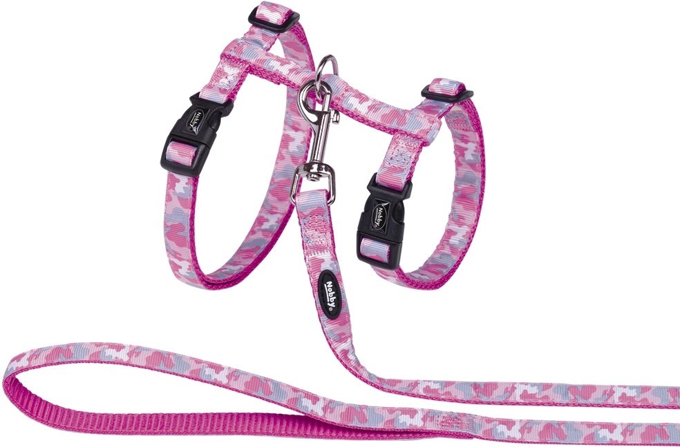 Nová kočičí souprava od Nobby vyrobená z odolného nylonu. Tento postroj s vodítkem je plně nastavitelný pomocí přezky a je opatřený pevnou kovovou karabinou. Postroj i vodítko jsou určeny převážně pro velké kočky. Oproti obojku drží kočkám pevněji celkovou postavu a předchází tak možnému tahání za krk a poškození páteře. Barva: růžová, maskáčový vzor Materiál: odolný nylon Velikost: XL, určeno pro velké kočky, šířka 13 mm Balení: 1x postroj a 1x vodítko