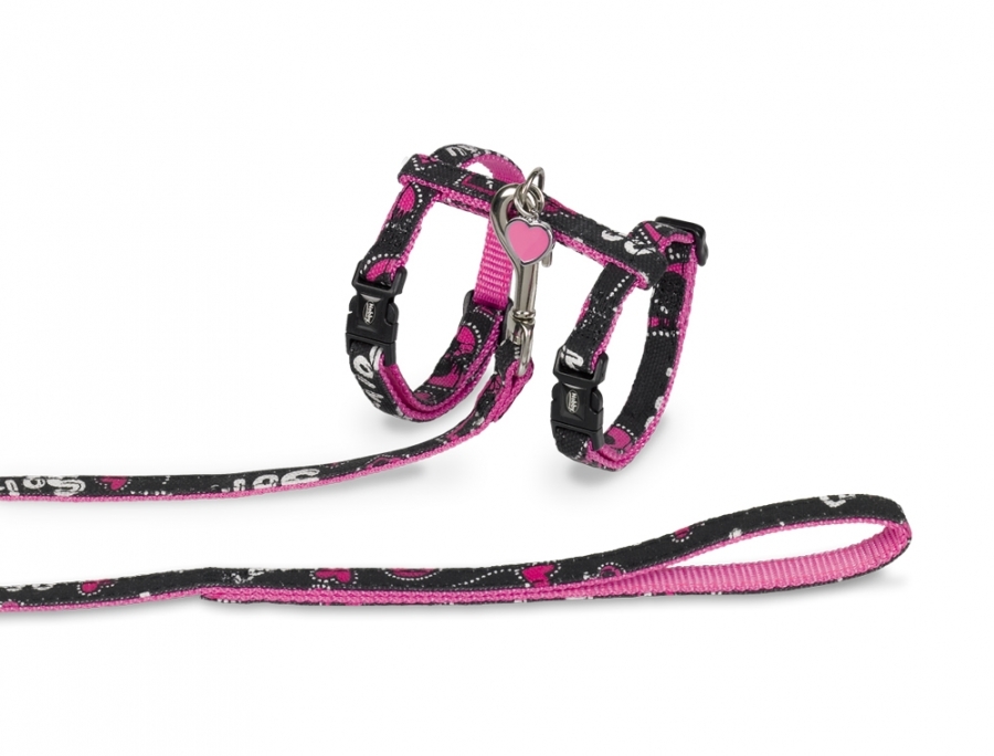 Set postroje a vodítka  pro kočky. Barva černo-růžová. Nastavitelná velikost postroje. Nylonový materiál. S dekorativním přívěskem. prečítať celé