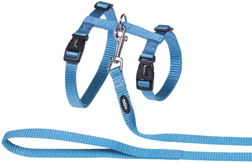 Nová kočičí souprava od Nobby vyrobená z odolného nylonu. Tento postroj s vodítkem je plně nastavitelný pomocí přezky a je opatřený pevnou kovovou karabinou. Postroj i vodítko jsou určeny převážně pro velké kočky. Oproti obojku drží kočkám pevněji celkovou postavu a předchází tak možnému tahání za krk a poškození páteře. Barva: modrá Materiál: odolný nylon Velikost: XL, určeno pro velké kočky, šířka 13 mm Balení: 1x postroj a 1x vodítko