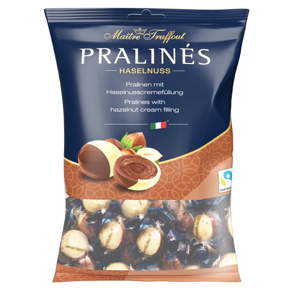 Maitre Truffout Pralinky Duo s lískooříškovým krémem 100gPralinky DUO od Maître Truffout spojují dokonalou souhru jemné mléčné a bílé čokolády, plněné lahodným lískooříškovým krémem.Obsah kakaové sušiny v mléčné čokoláde je nejméně 28%Použité kakao je označeno známkou Fairtrade. (Známka...