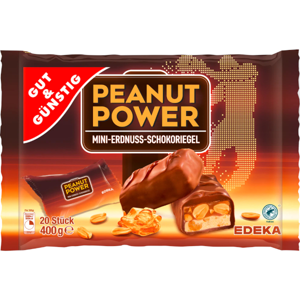 GG Německé čokoládové tyčinky s karamelem a arašídy - XXL balení 400GrSložení: mléčná čokoláda (cukr, kakaové máslo, sušené odtučněné mléko, kakaová hmota, mléčná syrovátka, mléčný tuk, emulgátor: lecithin, aroma), 27% karamelová náplň (glukózo-fruktózový sirup, cukr, palmový tuk, mléčný tuk,...