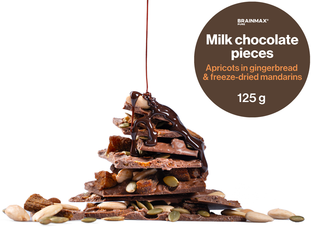 BrainMax Pure Lámaná čokoláda mléčná, meruňky v perníku a lyofilizované mandarinky, BIO, 125 g