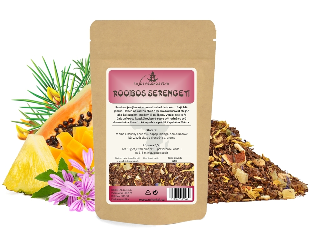 Svěží červený rooibos s příjemnou chutí exotického ovoce. Sladká papája, šťavnaté mango a lahodný ananas vytváří výborný ovocný mix do horkého léta. Pro maximální osvěžení vyzkoušejte rooibos připravit na studený způsob s kostkami ledu.Složení: rooibos, kousky ananasu, papáji, manga, pomerančové...