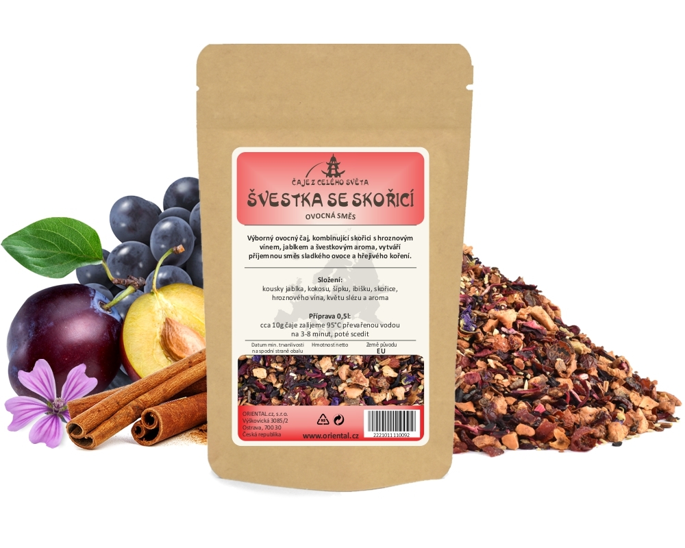 Výborný ovocný čaj, kombinující skořici s hroznovým vínem, jablkem a švestkovým aroma, vytváří příjemnou směs sladkého ovoce a hřejivého koření. Špetku exotičnosti do této směsi přináší kokosové lupínky. Neobsahuje žádné přidané konzervanty a barviva.Složení: kousky jablka, kokosu, šípku, ibišku, skořice, hroznového vína, květu slézu a aromaDoporučená příprava 0,5 litru čaje: Cca 10g čaje zalijeme 95°C převařenou vodou na 3-8 minuty, poté scedit.
