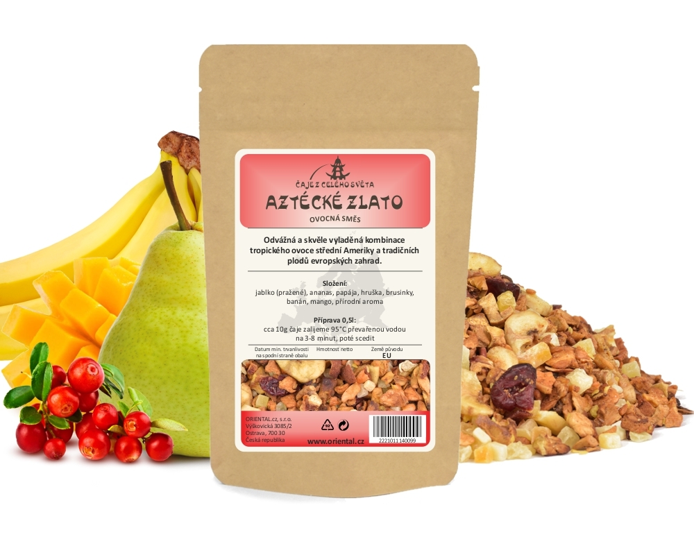 Lahodné tropické mango, papája a banán v kombinaci s tradičními plody evropských lesů a zahrad, jako jsou jablka, hrušky a brusinky. Odvážná a skvěle vyladěná kombinace ovoce z celého světa. Neobsahuje žádné přidané konzervanty a barviva.Složení: jablko (pražené), ananas, papája, hruška, brusinky, banán, mango, přírodní aromaDoporučená příprava 0,5 litru čaje: Cca 10g čaje zalijeme 95°C převařenou vodou na 3-8 minuty, poté scedit.