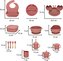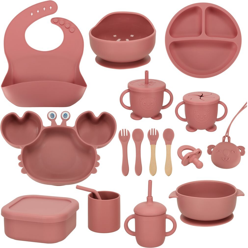 Sada 19ks silikonového nádobí pro děti. Sada obsahuje: misky, talířky, příbor, bryndák, hrníčky s víčkem, krabičku a dudlík. Misky obsahují přísavku. prečítať celé