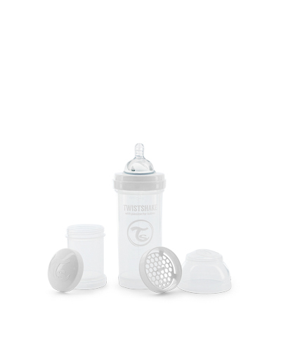 Kojeneckou láhev Twistshake je vhodné kombinovat s pravidelným kojením. Každá láhev obsahuje praktický zásobník b> a rovněž sítko b> na rozmíchání směsi. Jedinečný systém Twistflow aktivní snižuje b> riziko novorozenecké koliky b> a zajišťuje rovnoměrný tok mléka.
