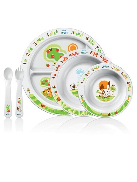 Praktická dětská jídelní sada Avent s obrázky. Sada obsahuje malou misku o průměru 13 cm, větší misku o průměru 17 cm, dělený talíř o průměru 21 cm, vidličku a lžičku. Jídelní sada je ideální pro pohodlné krmení, jak doma tak i během cestování. Protiskluzové dno zabraňuje vylévání pokrmu a...