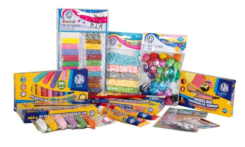 Zestaw Kreatywne Chwile zawiera:- farby dekoracyjne Astra o połysku metalicznym 6 kolorów - 10ml,- plastelina 12 kolorów pastelowa o zapachu limonki,- modelina cukiernicza zabawa 6 kolorów,- glina samoutwardzalna Astra 460g - biała,- Confetti cekinowe kółka na blistrze - mix 5 kolorów pastelowych...