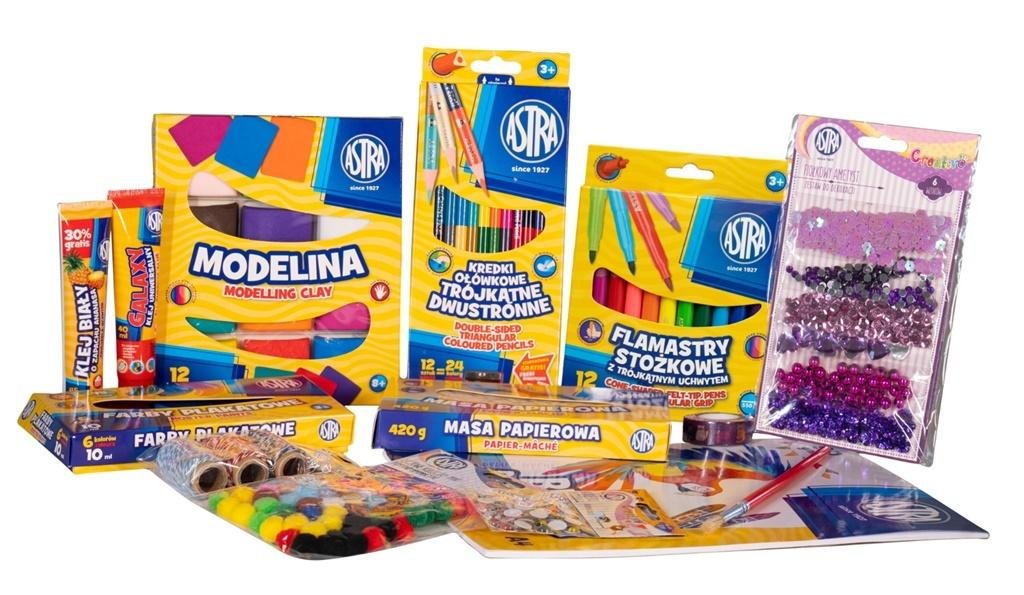 Zestaw Plastyczne Fantazje zawiera:- farby plakatowe Astra 6 kolorów - 10ml,- modelina Astra 12kol.,- kredki ołówkowe trójkątne dwustronne Astra 12=24 kolory,- marynarskie inspiracje - sznurki do dekoracji 3 sztuki x 10 metrów,- pompony dekoracyjne 15mm,- oczy samoprzylepne z rzęsami 10mm,-...