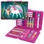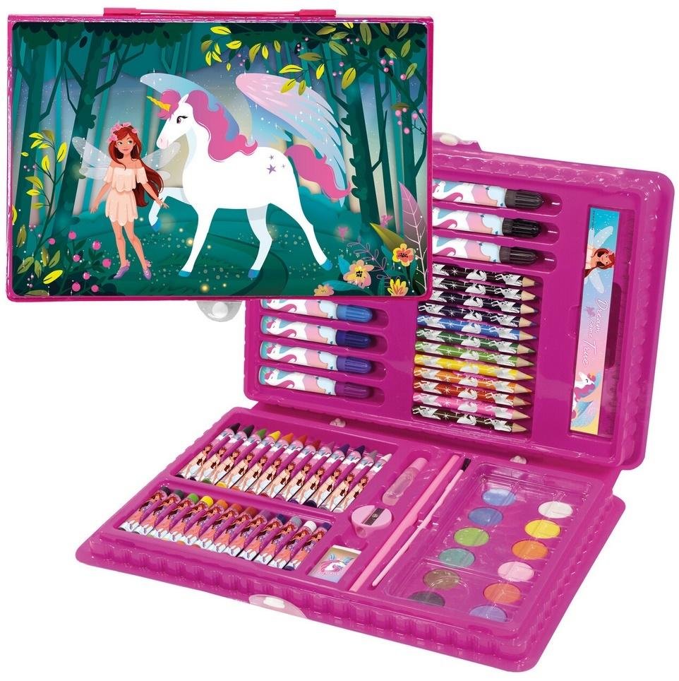 Zestaw artykułów plastycznych w walizce. W skład zestawu wchodzą: linijka, 12 pisaków, 12 kredek ołówkowych, 12 farb akwarelowych, 1 pędzel, 1 ołówek, klej, temperówka, gumka do mazania, 12 kredek woskowych, 12 pasteli woskowych + kolorowanka (4 kartki) + przeźroczysta paleta.